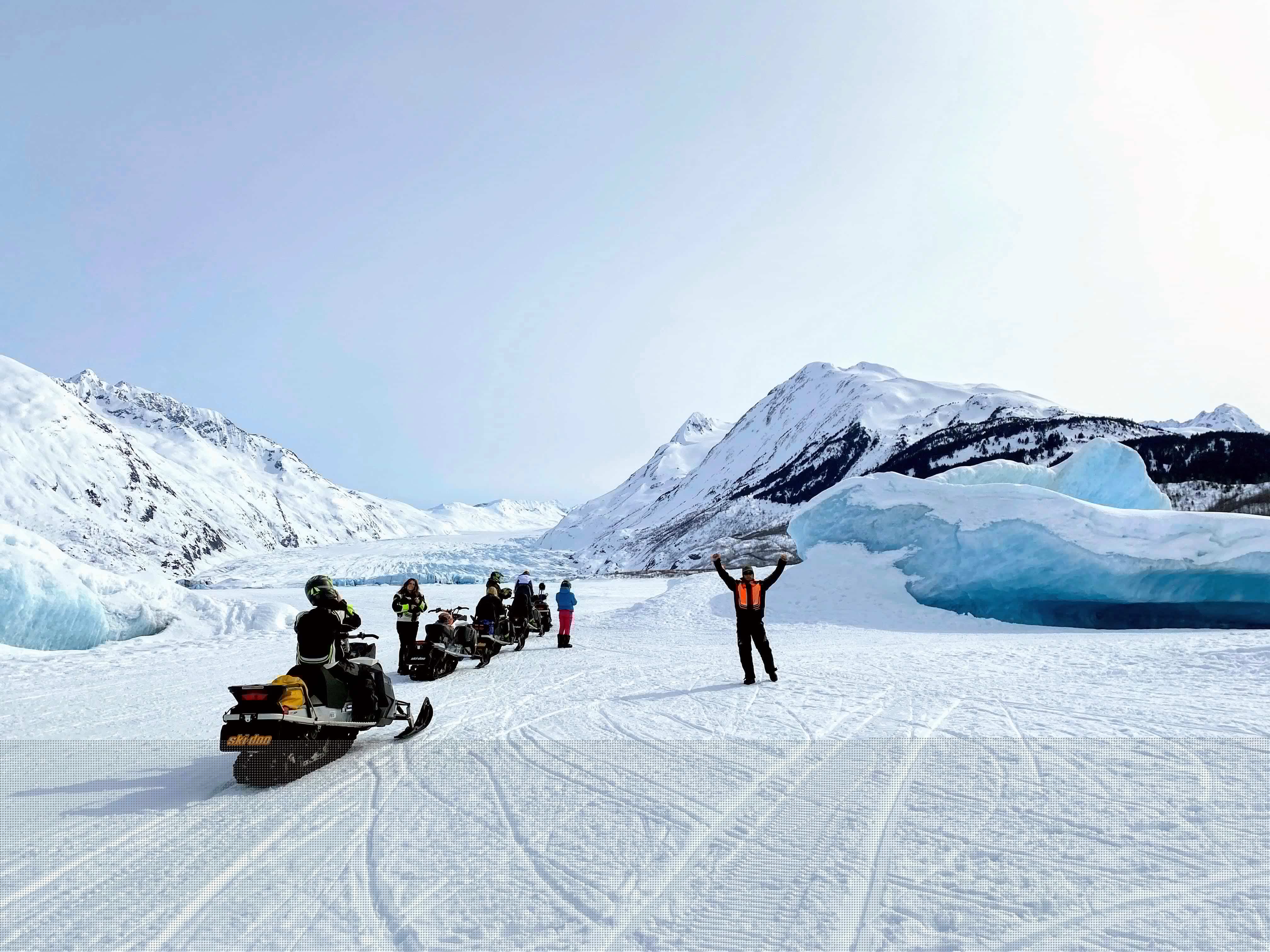Over the course of the next four days, you’ll Ski-Doo over 90 miles of groomed trails, head deep into the Alaska Range where you’ll explore glaciers and as many ice caves as your experienced guide can find. You will ride through pristine valleys, cross over frozen lakes and rivers and up mountain passes, and maybe – just maybe! – you’ll see one of nature’s most beautiful, life-changing shows – the Northern Lights. And you might also come across a moose or two. Your tour ends with some well-earned relaxation time at the Alpine Creek Lodge and a farewell dinner back in Anchorage.